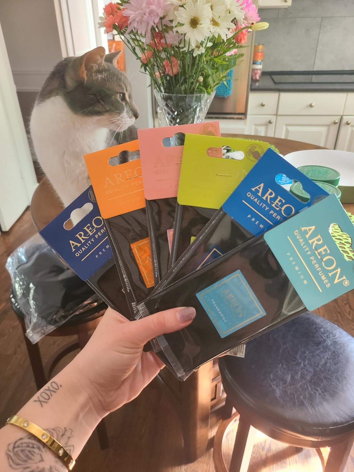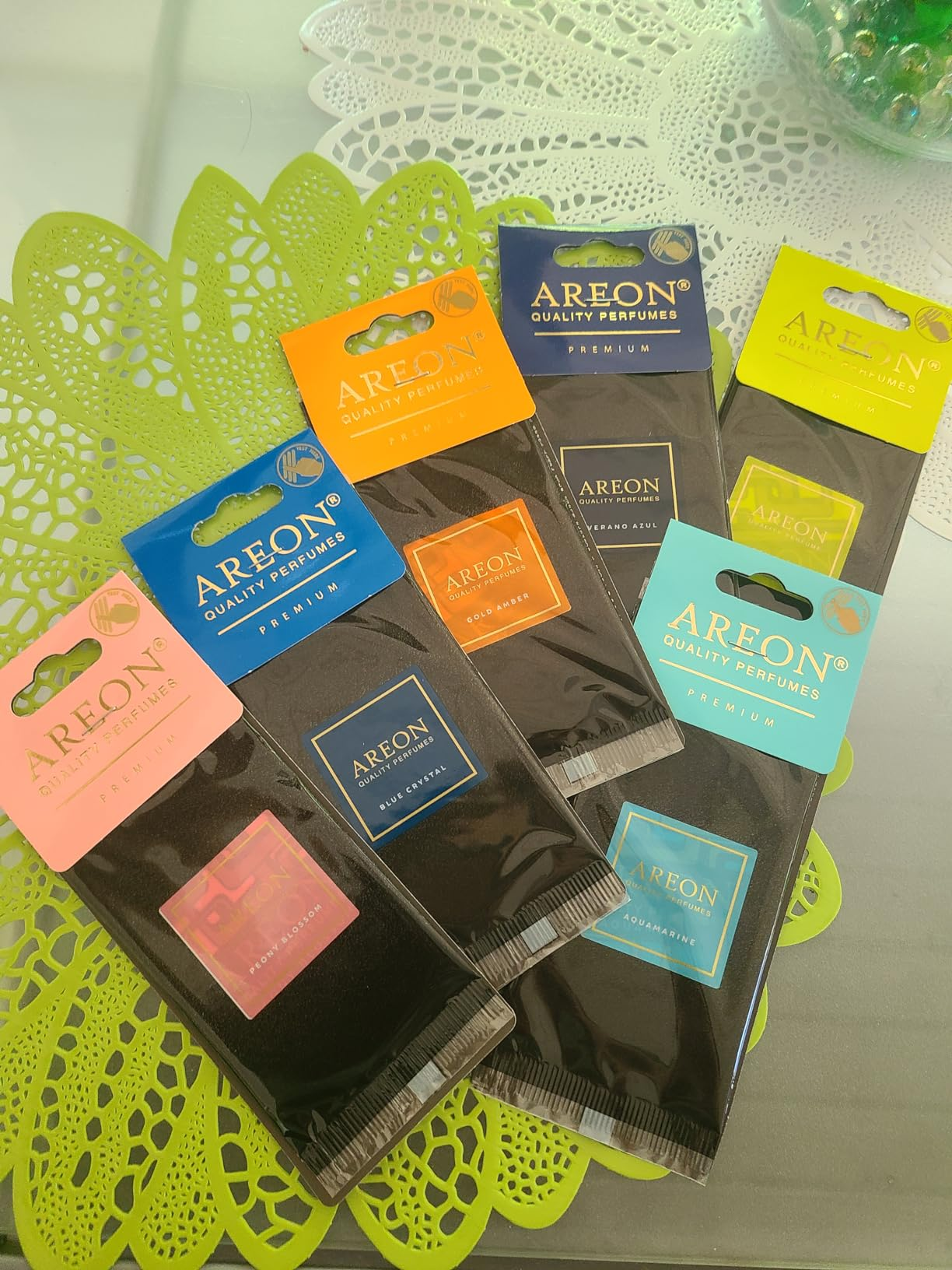 Discover your perfect scent with the Areon Premium (6 Pack)! This variety pack includes a scent triangle and tutorial video to help you find your favorite among the 6 scents: Verano Azul, Eau D'ete, Blue Crystal, Gold Amber, Aquamarine, and Peony Blossom. From refreshing to luxurious, indulge in a range of scents that cater to your taste.